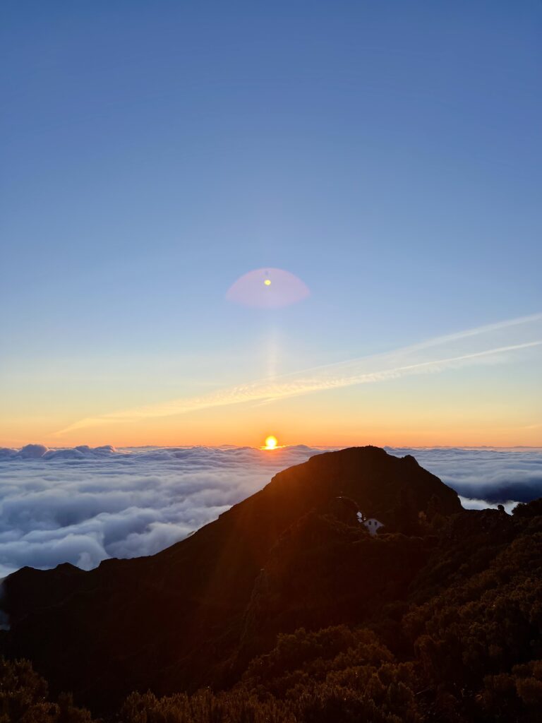 Lever ultra-matinal pour ne pas rater l’un des plus beaux spectacles de Madère : le lever de soleil sur une mer de nuages à 360°. Un moment magique ! On en a profité pour sécher les affaires détrempées de la veille, avant de descendre vers Boca da Encumeada pour se ravitailler et manger autre chose que du lyophilisé.